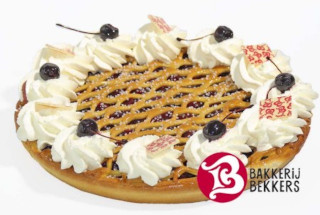 Traditionele zachte vlaaibodem met heerlijke kersen. Over deze vulling een raster van deeg voor de typisch Limburgse uitstraling. Opgemaakt met verse slagroom en witte chocolade snippers.