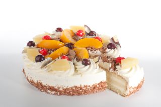 Bovenkant van de taart is opgemaakt met verschillende soorten fruit, slagroom en chocolade galettes.